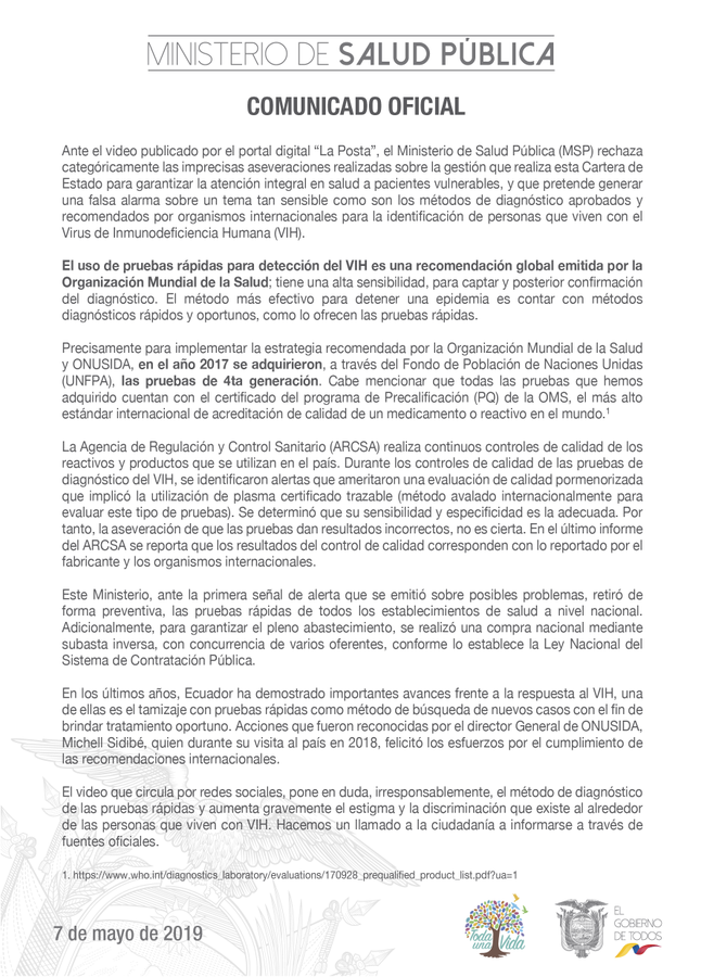 [COMUNICADO OFICIAL] En relación a la efectividad de pruebas rápidas VIH #MinisterioDeLaVida #DefendemosLaVida