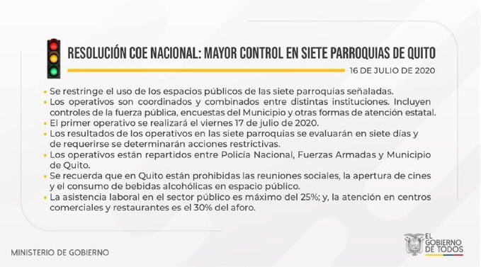 Rommel Salazar, secretario de Gestión de Riesgos, señaló que este jueves 16 de julio de 2020 se logró sectorizar siete parroquias de Quito en donde las Fuerzas Armadas, Policía Nacional y el Distrito Metropolitano controlarán el cumplimiento de las medidas de bioseguridad para evitar brotes de coronavirus en esos sectores.