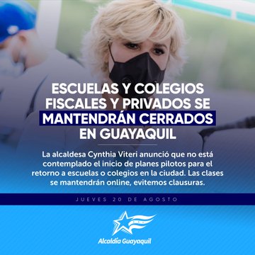 «El año lectivo 2020-2021 en nuestra ciudad sigue y seguirá bajo la modalidad online en escuelas y colegios, privados y fiscales. Seguimos tomando medidas para resguardar la salud de nuestros niños guayaquileños. La pandemia aún no termina», dijo Viteri en declaración a los medios.