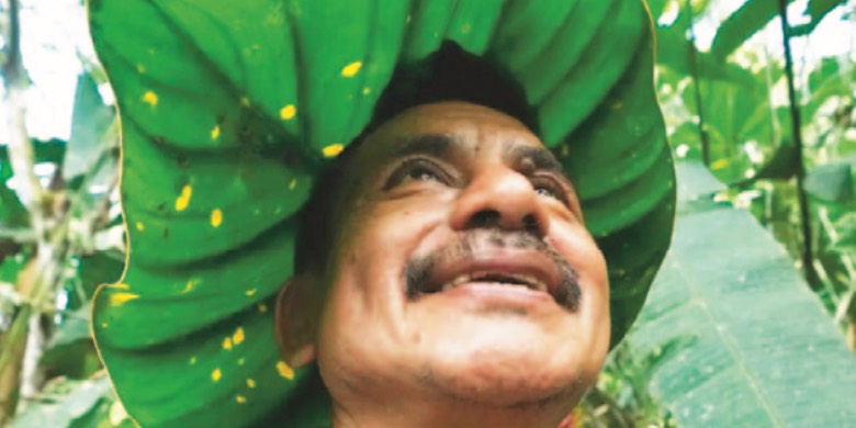 Ramón Pucha demuestra cómo convertir una hoja en un sombrero para protegerse del sol mientras busca semillas para cultivar en la finca de su familia, donde preserva especies nativas en un esfuerzo por proteger la biodiversidad, en Alto Ila, en la región amazónica de Ecuador.