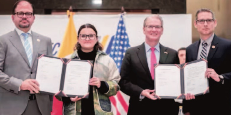 El ministerio de Interior y la vicepresidenta ecuatorianos, John Reimberg y María José Pinto, con el encargado de negocios de la Embajada de EE.UU. en Ecuador, Lawrence Petroni, y el director regional del FBI, Allen Pack, firman un memorando bilateral.
